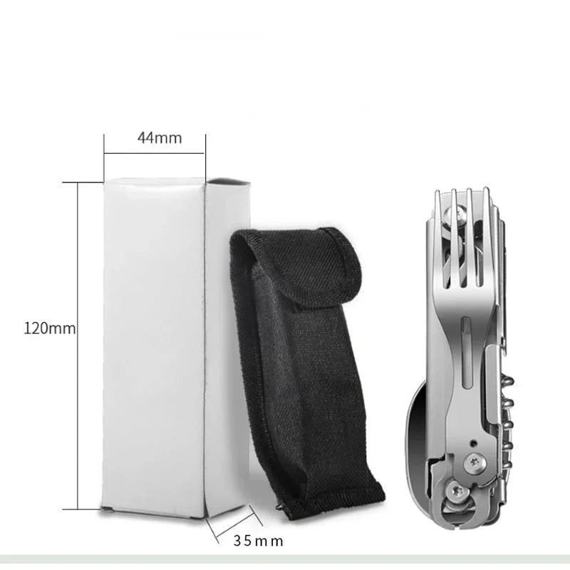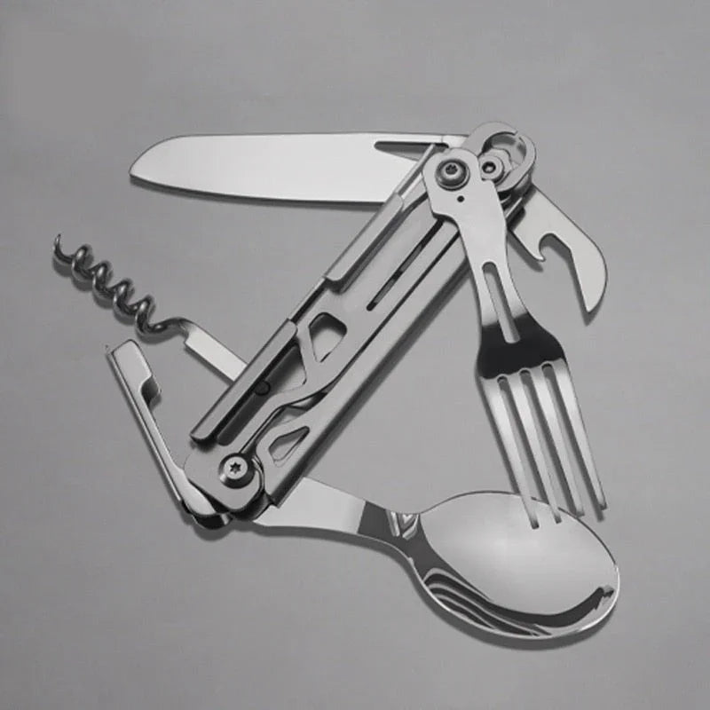 O Super Talheres®️ é uma ferramenta única que contém garfo, faca, colher, abridor de garrafas, abridor de latas e saca rolhas todos incorporados em um só. O design 6 em 1 faz dele o companheiro perfeito para seus passeios e viagens. O Super Talheres®️ é muito compacto e super fácil de limpar.